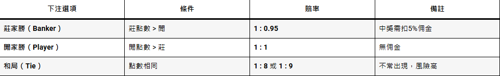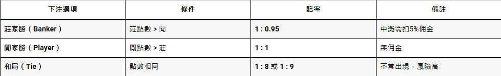 百家樂的下注選項雖然簡單,但每種選擇都有不同的賠率與風險,了解清楚賠率規則可以幫助你做出更好的下注判斷。